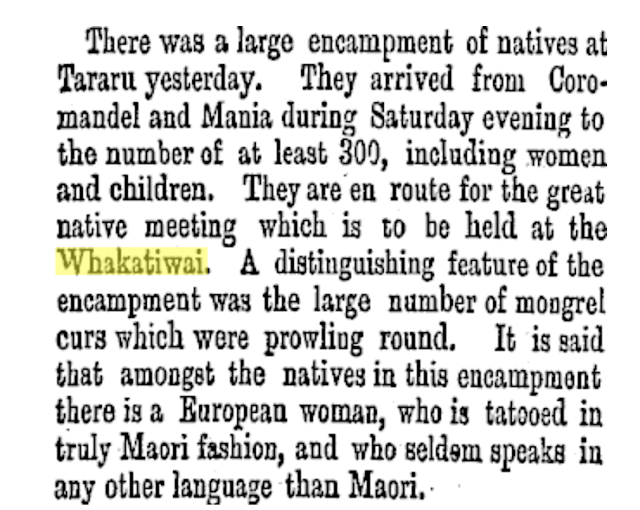 In August 1874, a 'great native meeting' was held at Whakatīwai. The hosts were Ngāti Pāoa and the purpose of the meeting was to discuss a large number of issues concerning land and resources. It was attended by all the iwi of Hauraki and it was so significant that numerous reports about the hui are recorded in the local press. See below: